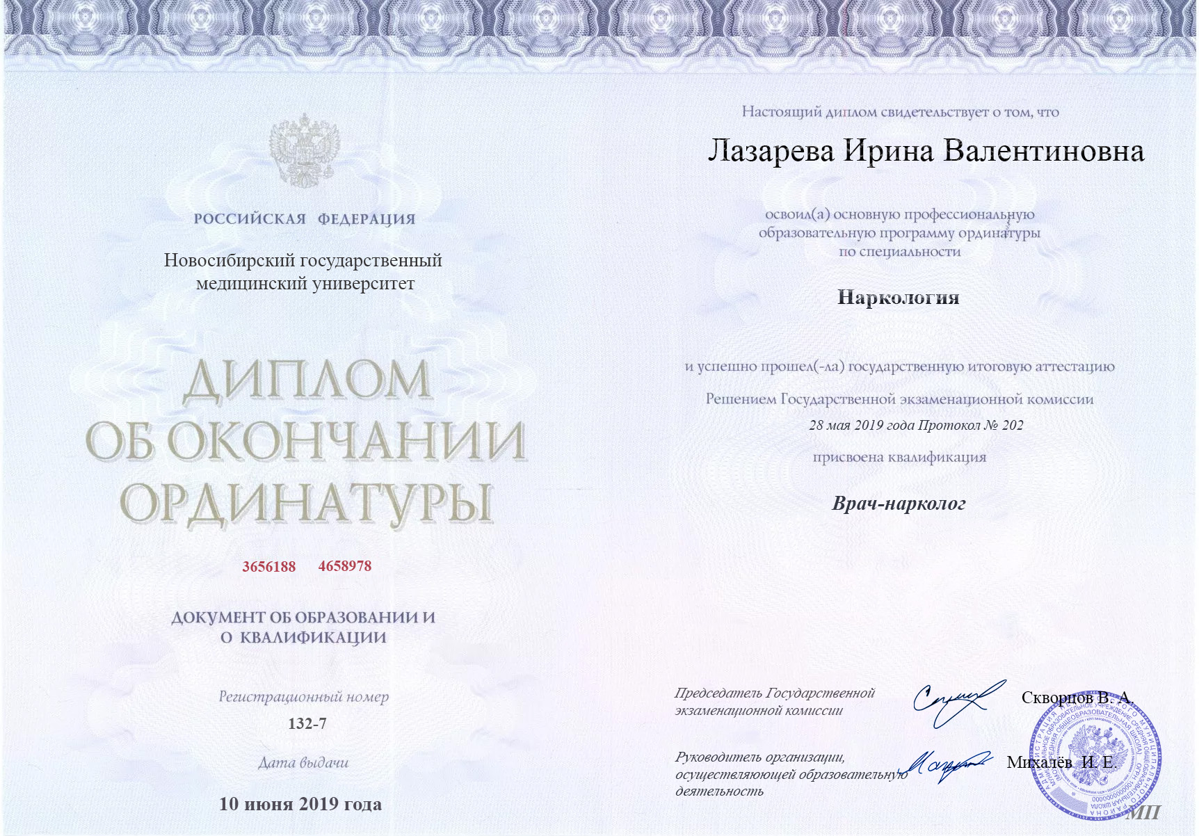 Ирина Валентиновна Лазарева — врач-нарколог с 4-летним опытом работы, специализирующийся на лечении зависимости от психоактивных веществ. Окончила Новосибирский государственный медицинский университет в 2017 году по специальности «Лечебное дело». А в 2019 получила диплом ординатуры по Наркологии.